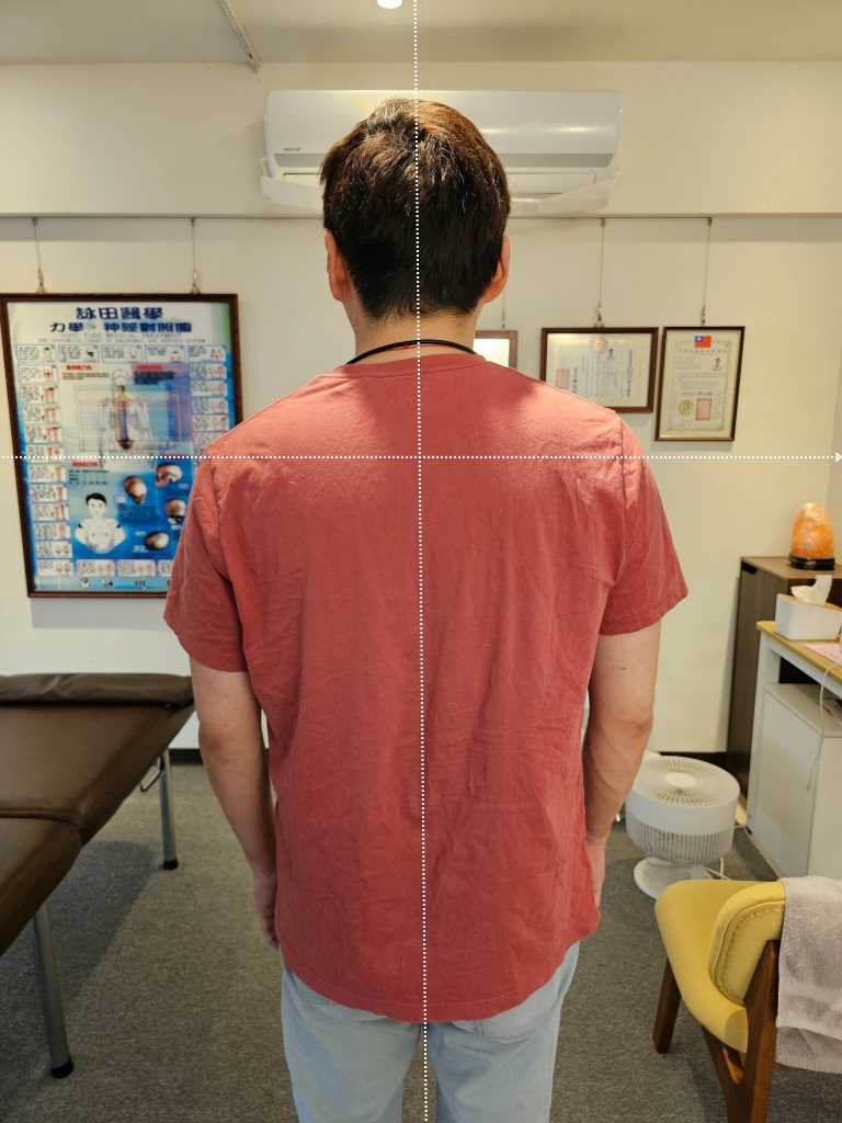 左圖為調整前,右圖為調整後,身體中軸線更對齊,站姿也更加穩定放鬆。